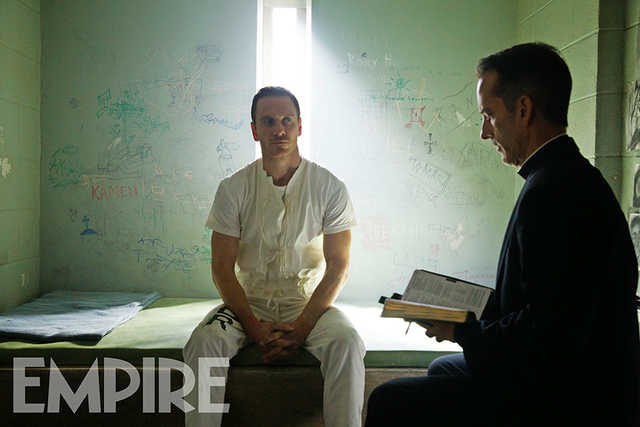 The two photos show off the two different timelines. At left is Fassbender as Callum Lynch in the modern day, sitting in a cell that looks like it might be adjacent to the Suicide Squad's. And at right is Fassbender as Callum's ancestor Aguilar in the middle of an action-packed sequence with swinging swords, burning pyres, and agitated onlookers.