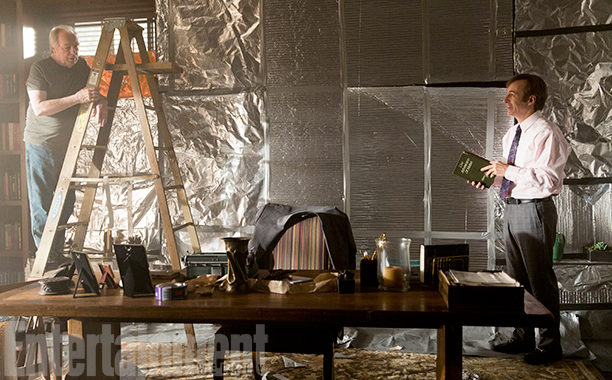 Case in point: the other photo shows Jimmy in the same room as big brother Chuck (Michael McKean), chatting quite amiably despite their relationship becoming mired in mutual betrayal last season. Chuck looks as happy and healthy as he ever has on the show (which isn't saying much, but still), and Jimmy is holding a copy of The Adventures of Mabel for some reason. Is this just the calm before the inevitable storm? Remember, season two ended with Chuck guilting Jimmy into an admission of guilt... which he secretly recorded to use against his brother in court. Yeah, there's no way that ends well.