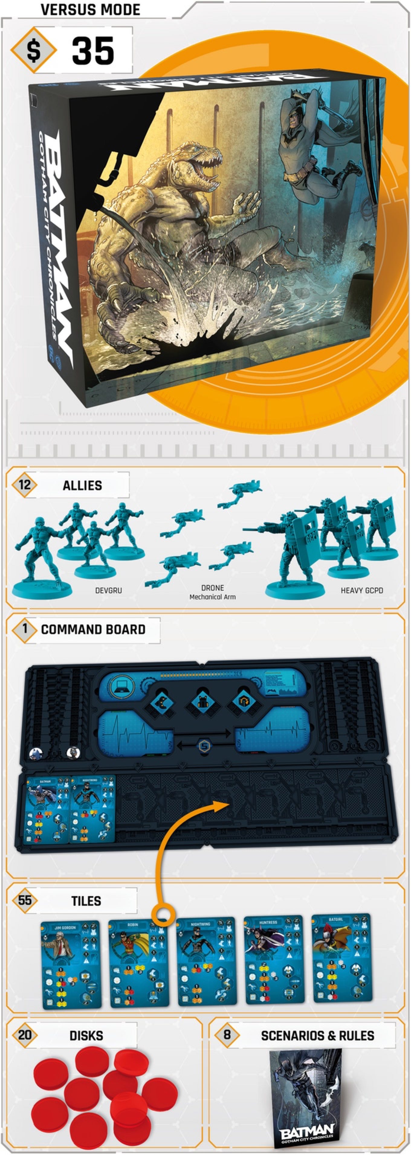 The core box is packed with minituares, including Batman, Catwoman, Robin (Tim Drake), Batgirl (Barbara Gordon), Nightwing, The Huntress, Commissioner Gordon, a bunch of Gotham City Police Department cops, drones, SWAT troopers, civiliions, by-standers, and for the villain side of things you get Bane, Killer Croc, Clayface, Joker, Harley Quinn, The Ridley, Scarecrow, Mr. Freeze, Poisen Ivy, a bunch of brutes, thugs, Harley Quinn's gang, carnivorous plants, Riddler's gang and more. The designs are all based on classic Batman comic book art, including the work of legendary artists like Jim Lee.