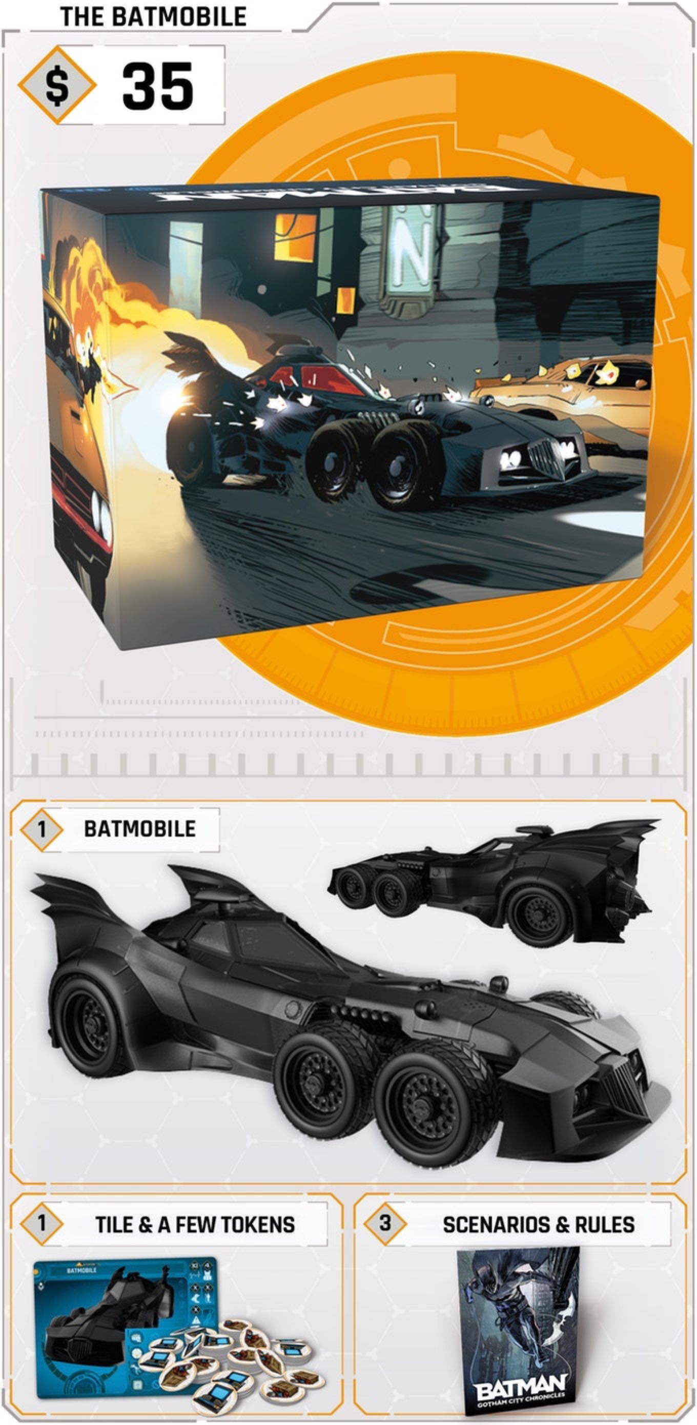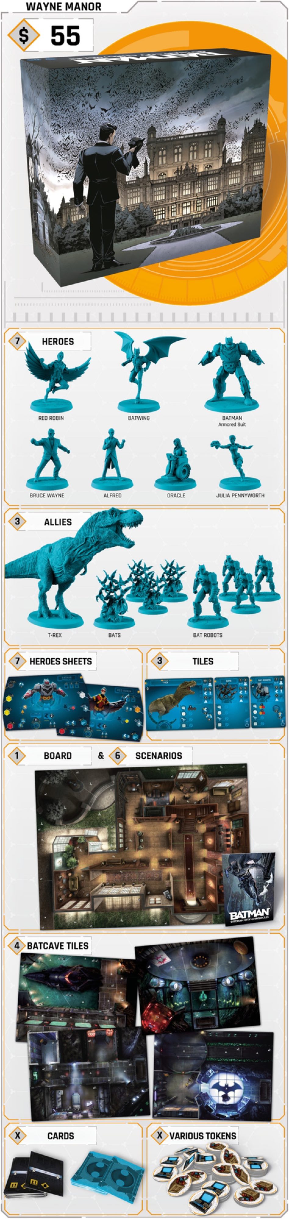 They are also releasing a ton of extras, including a Wayne Maynor (which includes a colossal T-Rex mini) and Arkham Asylum expansions, each with their own boards, scenarios and minis, a versus mode pack and a huge scaled Batmobile that is playable in the game.