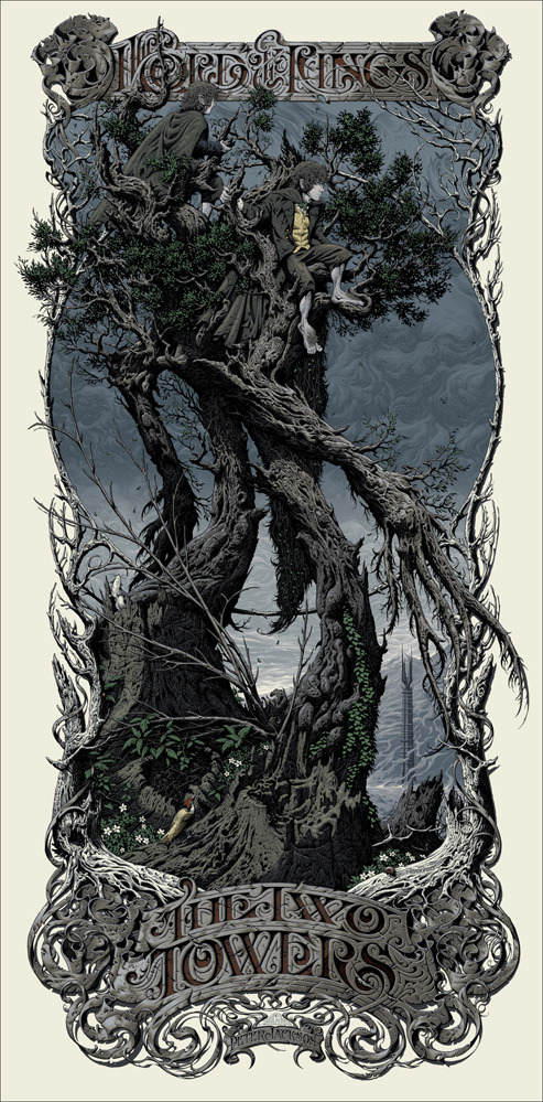 First up, here's the regular (left) and variant (right) of Aaron Horkey's poster for The Two Towers.