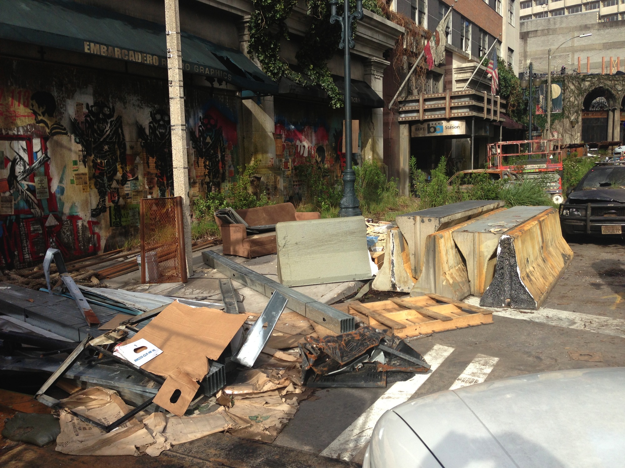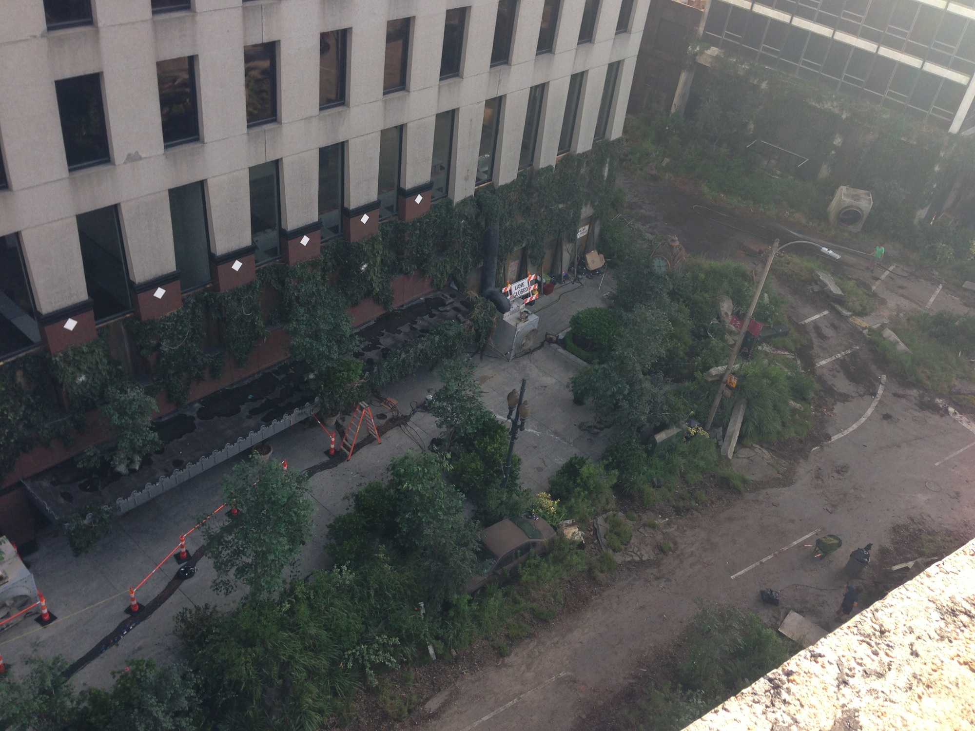 The set we saw is a couple blocks of Downtown San Francisco. They recreated streets in the Embarcadero area leading up to the ferry building. The streets are muddy, filled with trees and planets that have overgrown and are taking over. The ferry building has vines covering it. Remnants of 2013 are on some of the buildings. A dirt-covered Muni bus lays abandoned in the street in between some shrubbery. A billboard which took a suicide dive from one of the skyscrapers lays destroyed in one of the streets. A few abandoned, rusted-out cars have greenery growing out of and around them. A huge FEMA van is at the end of the street. A cable car is in a small ditch with grass growing on the roof. Huge 15 feet high metal gates topped with barbed wire block the ferry building.
