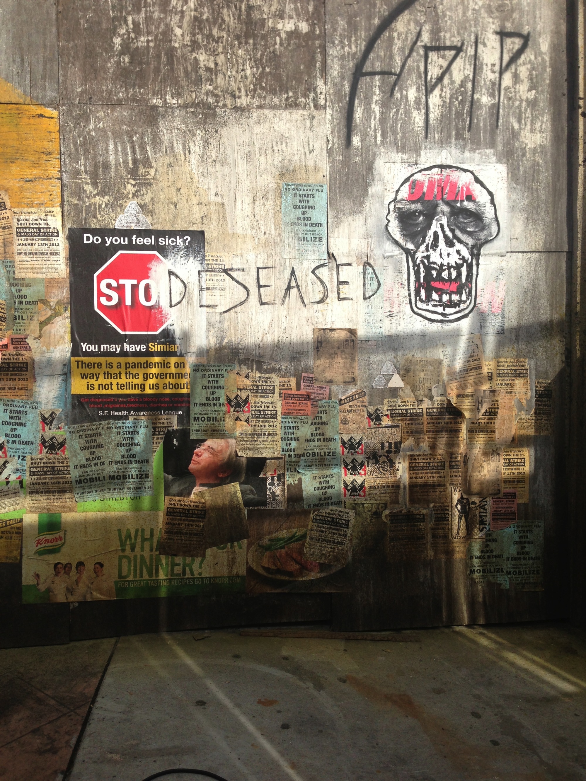 San Francisco is a shell of its former self, and there are some signage remnants from when the plague was in full force. Flyers warning of the virus, curfews, and such still cover the walls a decade later. There was Banksy-inspired street art showing a human throwing up blood.