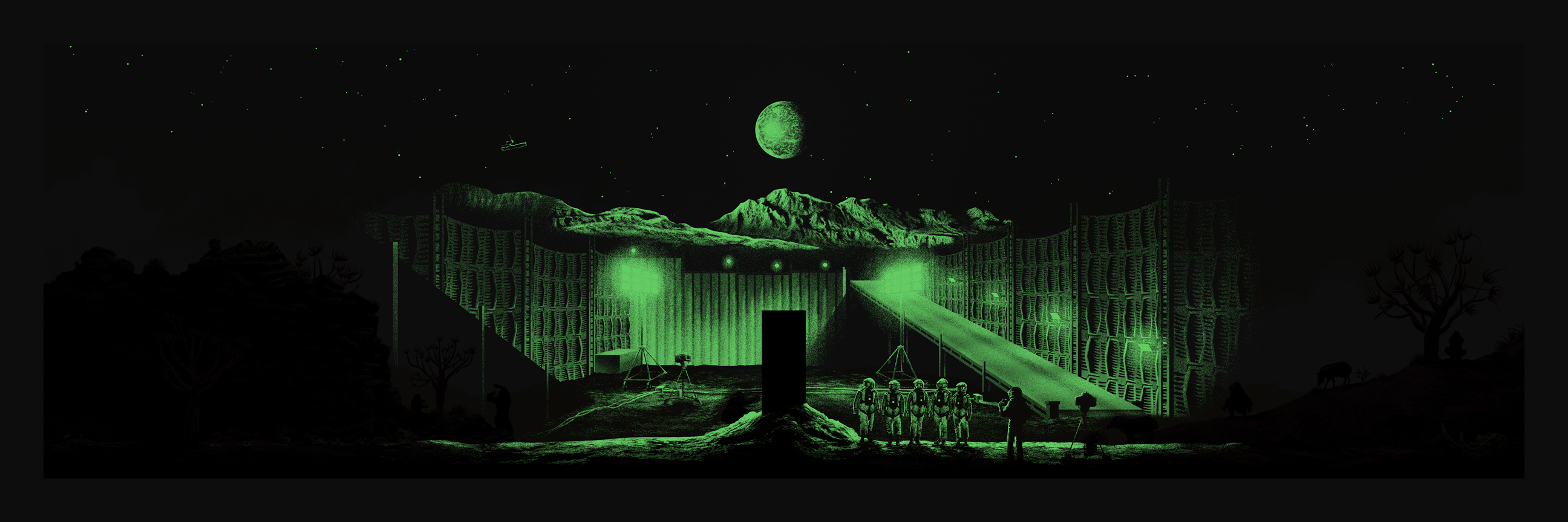 At Gallery 1988 East, Mark Englert will have his first solo show called Director Series: Kubrick. It's an entire show of posters based on the films of the legendary director, and the first in a soon-to-be annual tradition of Englert applying his signature detailed landscape style to the films of a specific director. Below, we exclusively debut Englert's posters for 2001: A Space Odyssey and Dr. Strangelove.