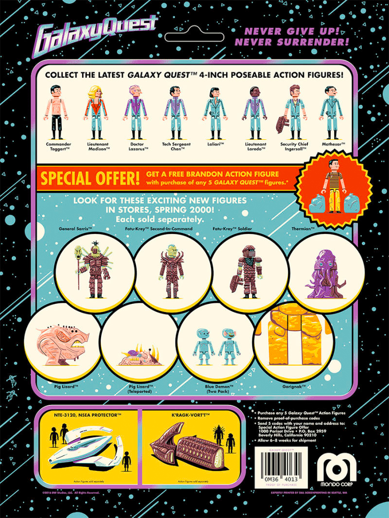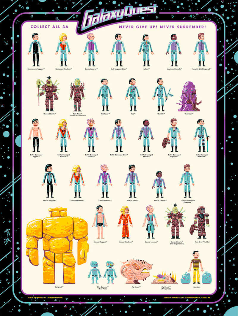 Instead of being sad that we'll never see the crew from the NSEA Protector back on the big screen again, we can take the time to appreciate that the film still has some loyal fans. Thankfully, one of those fans is a talented artist named Andrew Kolb, and he's just teamed up with Mondo to release a pair of fantastic new prints that imagine a world where Galaxy Quest action figures were available on shelves. Check out the Galaxy Quest prints after the jump.