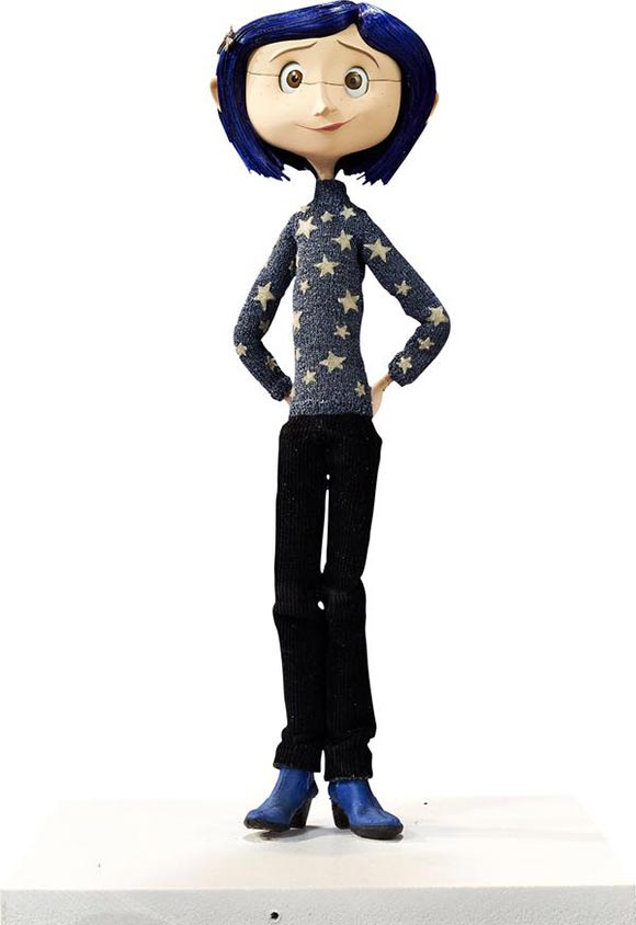Coraline production puppet in her iconic blue-starred sweater