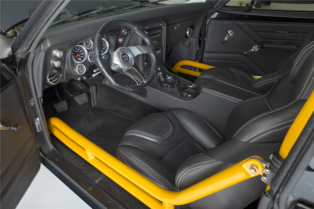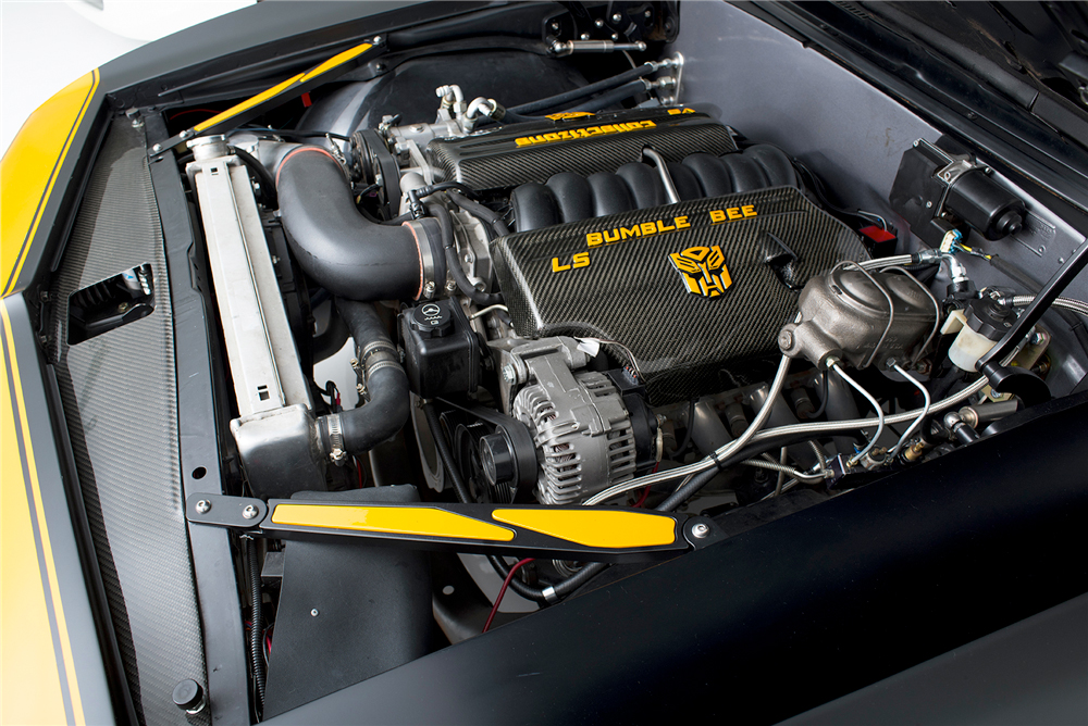 Fuel-injected Corvette LS3 engine, 6-speed overdrive transmission, custom suspension, mini tubs, Wilwood brakes plus added stunt extra caliper, 9" Ford rear end, touchscreen navigation stereo system, custom three-piece racing wheels, Nitto low-profile tires, hideaway headlights, custom Halo LED yellow headlights, yellow Ridetech "TigerCage" rollcage, custom-made carbon-fiber fender flares and front splitter, power hood latch, satin black paint with high-gloss yellow accents, carbon-fiber engine covers, Auto Meter Cobalt gauges, system kill within glovebox, Eddie Motorsport hood hinges, custom billet core support bars with yellow accents, smoothed firewall, hydraulic braking assist.