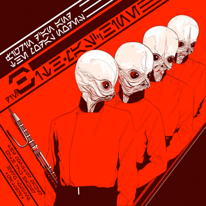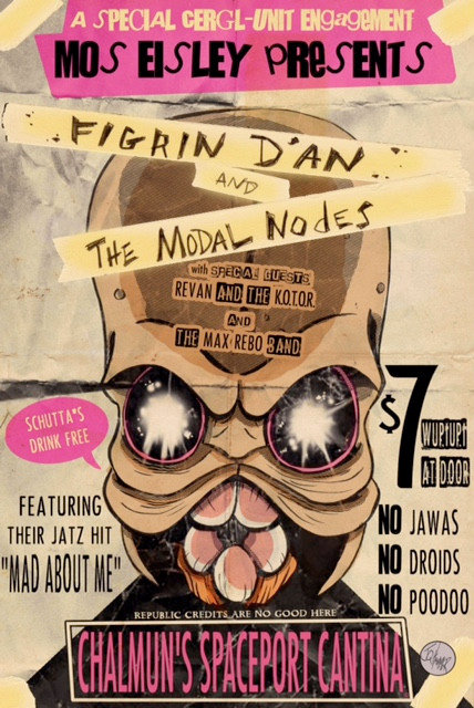 My favorite piece out of this batch is the Star Wars-inspired poster, if only because it's like a real album cover for Figrin D'an and the Modal Nodes (one of the best movie bands), complete with Aurebesh text. More dedicated fans will have to translate what the poster actually says, but even without knowing that, I know it would look good next to my Max Rebo Band tour poster.