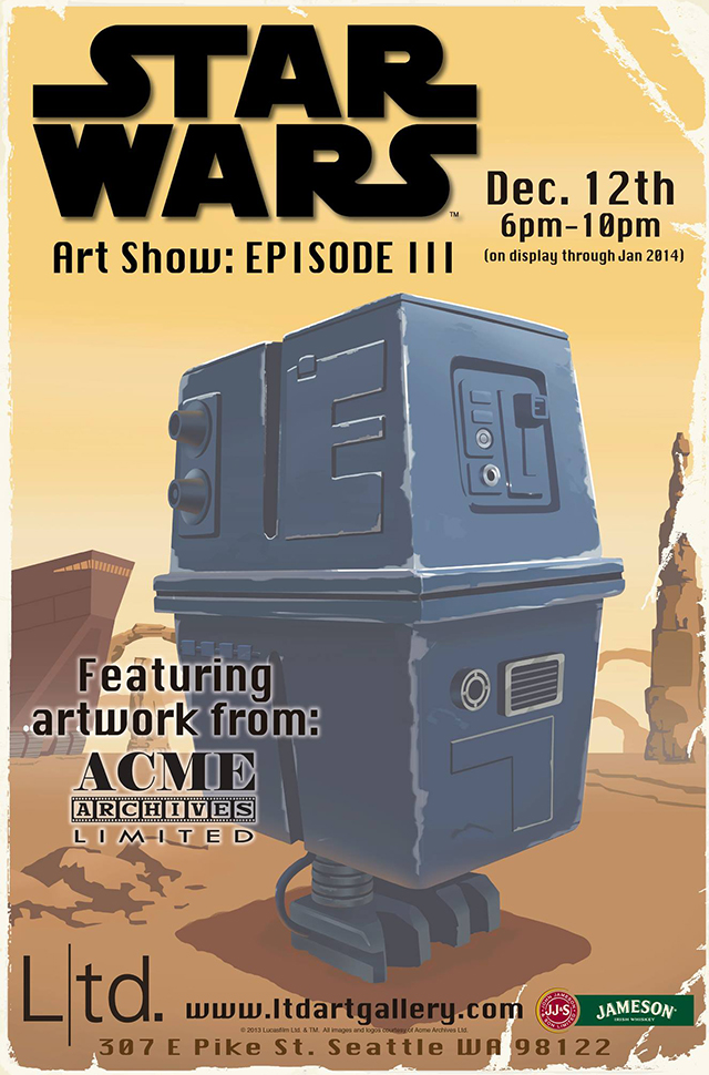 The Ltd. Art Gallery in Seattle is opening its third annual Star Wars-themed group art exhibit this week. Featuring "a collection of original and limited edition artwork inspired by the greatest saga ever told," the show runs through January 2014. See a poster and some highlighted works below.