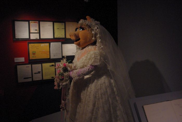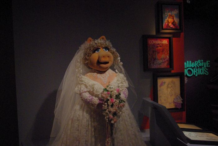 The area is mostly dominated by a wall on which is projected every single Muppet Show ever made, simultaneously. It's hard to pull yourself away from it. The entire original logo for The Muppet Show takes up another wall, in front of a stunningly new-looking Miss Piggy in her bridal outfit from The Muppets Take Manhattan, which came out in 1984. It's proof that the hundreds of thousands of dollars they spent restoring the puppets was well spent.