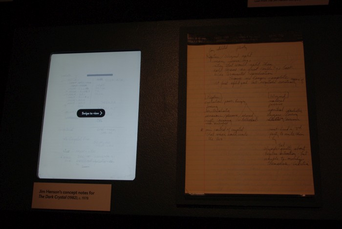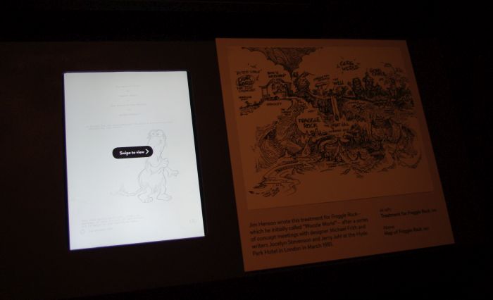 Along with the interactive portions, they use some tech in innovative ways, too. You know how in most museum exhibits they might have an artifact that's an original book, one that's laid out open under a piece of glass? They have that here, but they also took the great care to scan these documents as well. Touch screen panels next to the artifacts let you swipe through the recreated documents and read the whole thing, allowing you to browse Jim Henson's original concept notes for The Dark Crystal and his treatment for Fraggle Rock (originally called Woozle World!). It's a great concept and will allow people to read something that they never would have been allowed to get their hands on otherwise.