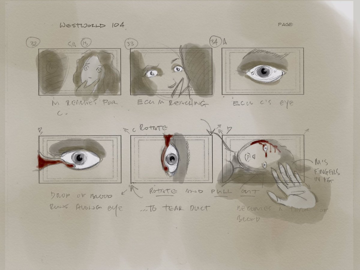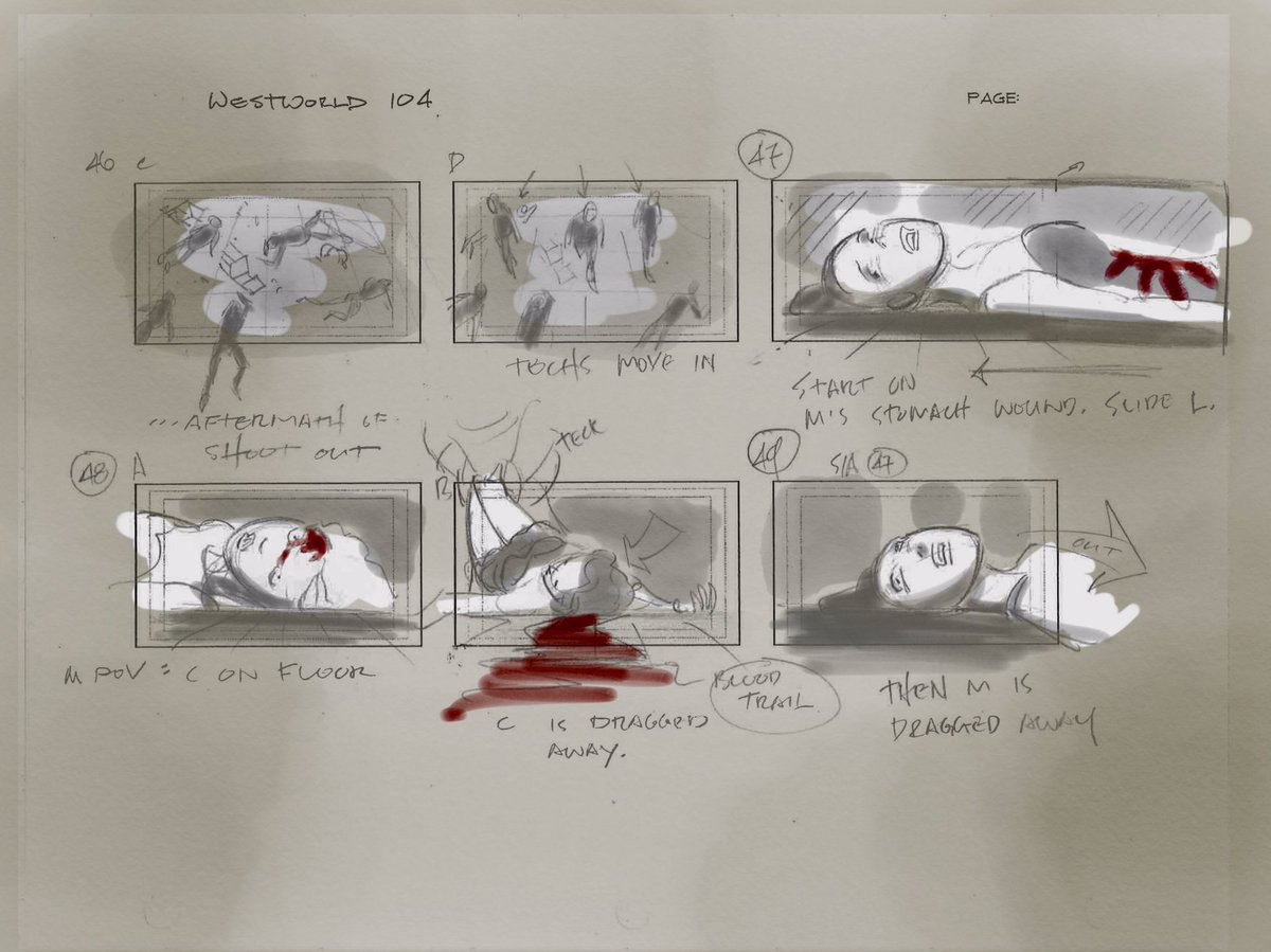 Vincenzo Natali, the director of Westworld's fourth chapter "Dissonance Theory" (as well as movies like Cube, Splice, and Haunter), shared his storyboards for one of his episode's key sequences: Maeve (Thandie Newton) experiencing a violent flashback to one of her many deaths. While some storyboards are beautifully drawn and composed and exist to sell a specific tone to everyone working on a film, these storyboards are just plain practical, clean reference drawings covered with pencilled notes explaining where the camera needs to be for each moment. You can explore them for yourself in the gallery below.