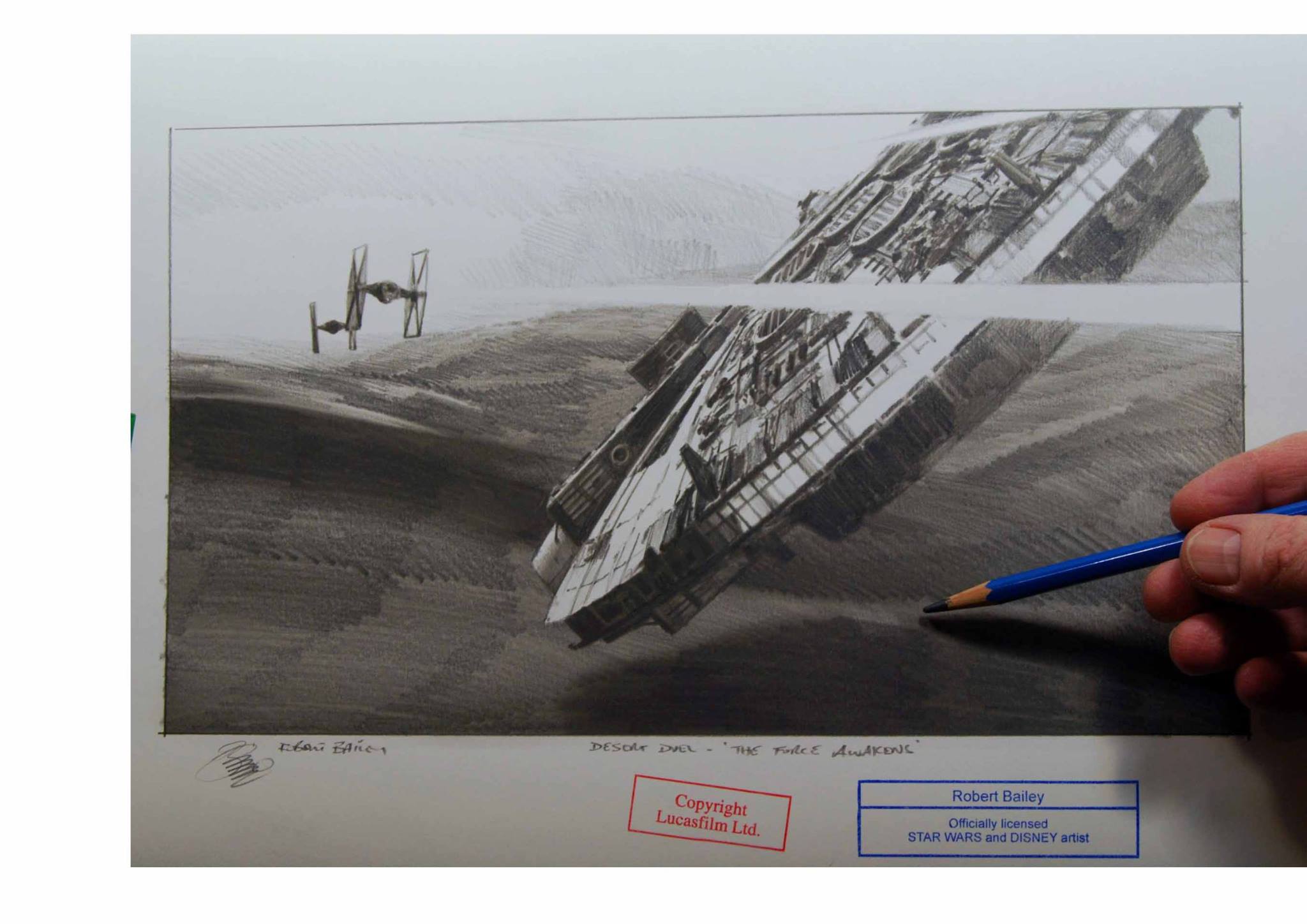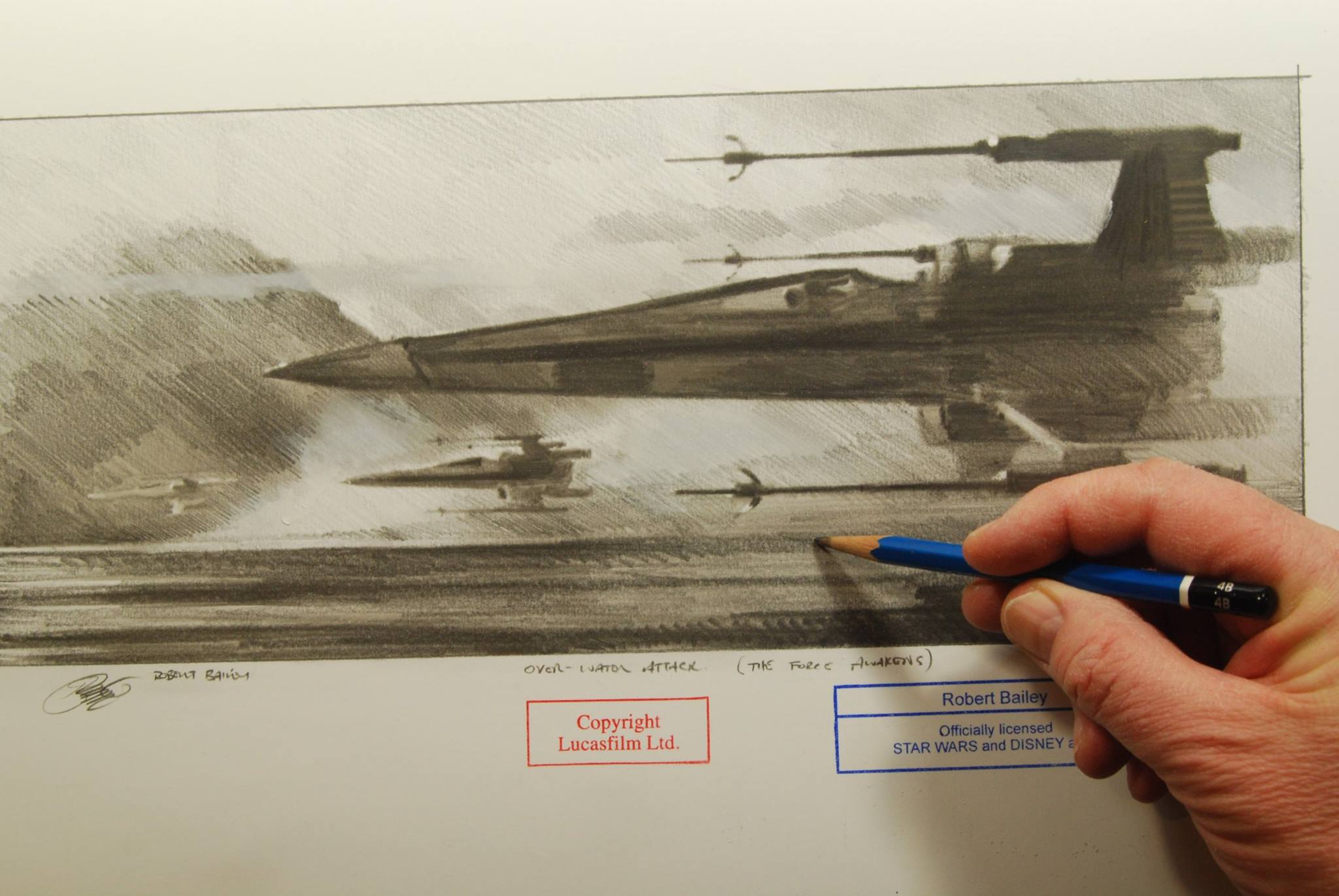 Official Disney and Lucasfilm artist Robert Bailey has been posting artistic representations from Star Wars: The Force Awakens on his Facebook. Two of the images, seen below, are just images from the trailer, redrawn. But the artist mistakenly posted some color images of X-Wings that may or may not have been the film. They've been removed, but Star Wars 7 News has them.
