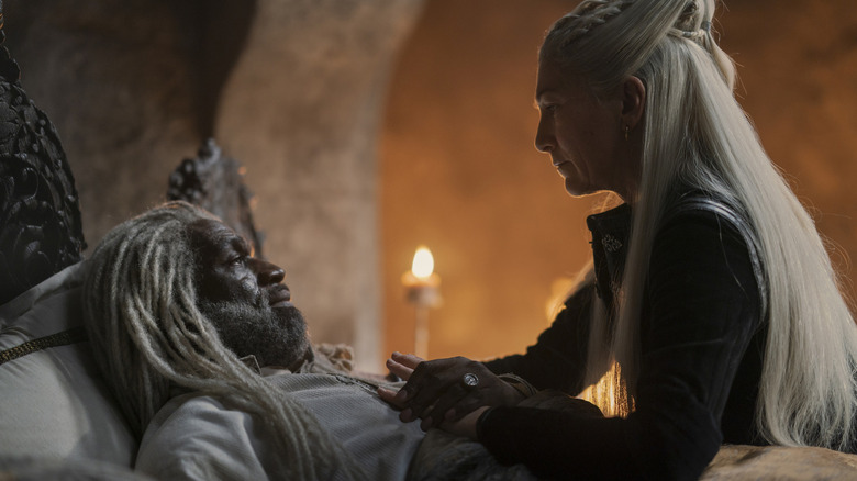 Rhaenys declares for Rhaenyra and pushes Corlys (Steve Toussaint) to do the same. Just when he was finally coming to his senses about putting pride and ambition aside for survival, she rallies his support for Rhaenyra. This gives her a powerful new ally. The Stepstones (which have officially gotten more mention than the fourth child you didn't know Alicent has!) have finally become important to the story! Now that Corlys has taken control of them, he has the power to completely cut King's Landing off from trade and travel. This blockade is a great, non-dragon-related approach to taking the throne back and Rhaenyra is thrilled.