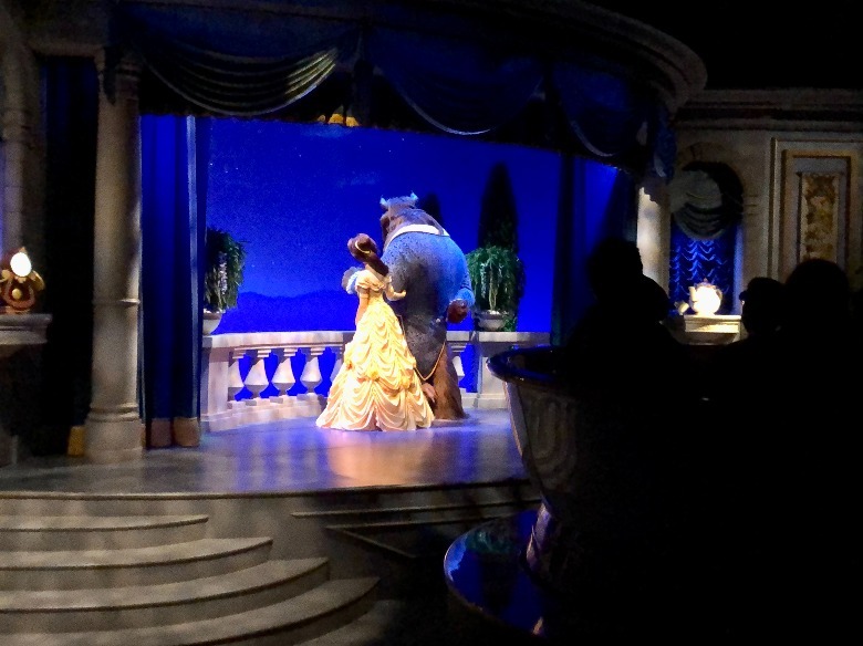The highlight of the preshow is when Belle and the Beast appear as Audio-Animatronic figures on opposite balconies, with him skulking in the shadows until she urges him to come into the light, like in the movie.
