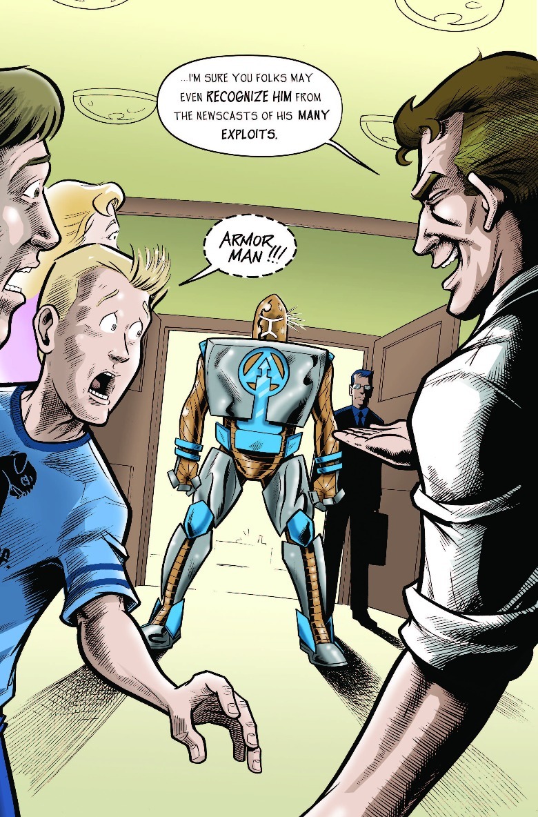 In this case, an A-lister from the Marvel universe that will certainly jump out at readers is name-dropped, though doesn't actually appear. Instead, we're introduced to a new hero in the form of Armor Man that wows the boy and his family. He looks like a Golden Age hero ripped straight from the pages of some forgotten DC Comics title of old. It's a shady world with shady individuals running it that is quite unlike anything I've ever encountered in all my years of reading comic books. At this point, different is welcome in superhero media.