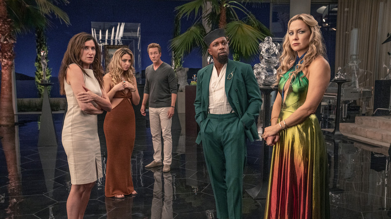 As noted, Benoit Blanc looks like he fits in with the eclectic crew of disrupters in "Glass Onion." But he pulls his own version of a Columbo, open-mouthed in awe at Miles Bron's opulent island and the eponymous glass structure at its center, which houses a slick blue Porsche ("because there's nowhere to drive it on the island"). And while Blanc's seeming humility in the face of such expense may be partially genuine, it's there to have the characters let their guard down. (Benoit later dubs it "Southern hokum.") One of the film's great comic moments comes right after Miles reveals the centerpiece of the weekend: a three-day mystery in which the other characters are given clues and meant to figure out who "killed" him. "What do we win?" Benoit asks innocently, to a man who's seemingly won everything and is surrounded by a lot of other people who have also seemingly won everything. When Benoit tries to explain that the concept of the game implied a prize for the winner, he names the iPad as an example of a potential prize. "...Sure, you can have an iPad," Miles offers blankly. And then, about a minute later, Benoit explains the entire mystery without Miles having offered a single clue. Instead of Miles or the others being impressed, they're mostly baffled. (Miles is annoyed, because he paid "Gone Girl" author Gillian Flynn to write up the scenario, "and she's frickin' expensive.")