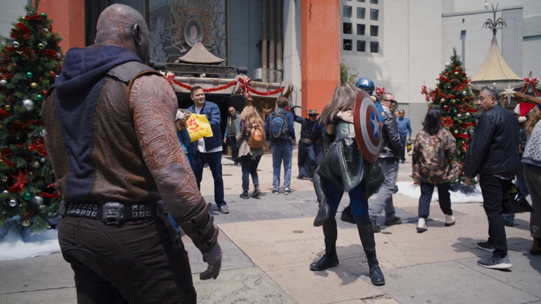 It's there that Drax attacks a man dressed as a robot, hinting at the existence of GoBots in the MCU. But the more important revelation comes when Mantis reacts to a performer dressed as Steve Rogers' Captain America. Mantis takes one look at the dude, shrieks Steve's name, and launches herself at the poor, unprepared actor. The man immediately flees the scene in a panic — which is fair. But all things considered, he ought to be prepared for occasional tackling if he's gonna walk around LA dressed as an Avenger.