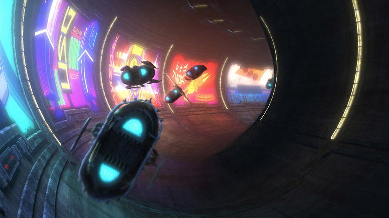 Rau: Those were so fun. They were fun in our writers' conference as we start trying to doodle, "How are we going to create this?" The race was really interesting. One of the big things we figured out is we wanted to put the race in tunnels so that we could have high-speed backgrounds flying by. We have these ads on the walls, kind of like in a Formula One race. We were looking at not just the legacy of the podrace, but the classic podracing game from Nintendo 64, we were looking at that a lot. Played a lot of that back in the day.