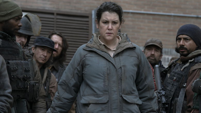 After the ambush, the rest of the episode is essentially set up for at least the next episode, introducing us to the rebel cell that seemingly took over FEDRA in the town, led by Melanie Lynskey. She is mad, looking for someone named Henry, and has an entire militia searching for him and someone named Sam. This is completely original to the game, and there's some potential, but the episode doesn't spend enough time with them to really make us understand the situation or the characters. Curiously, they're hiding something big and strong in a building, which makes the ground shake.