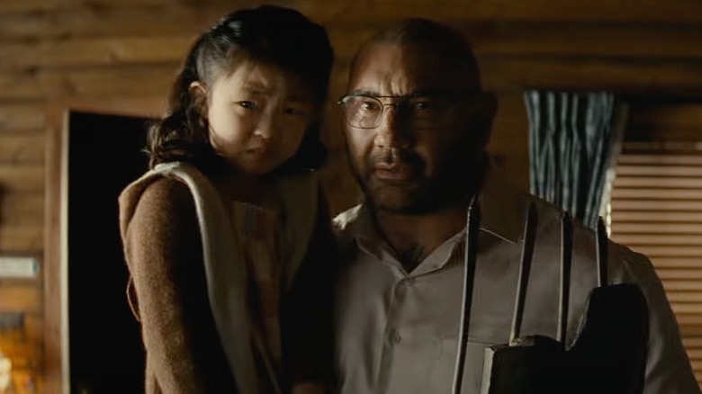 As sweet as Andrew and Eric still having each other in Tremblay's ending is, there's a tinge of irony marked on their path home. Instead, Shyamalan lets us feel the weight of tragedy but doesn't let us forget about hope. Eric is dead, yes, but the apocalypse is over and there's hope that Wen will grow up to be an accomplished woman thanks to his sacrifice. Andrew, a man who has been embittered by his life of experiencing prejudice for his sexuality and observing the worst of humanity, has evolved — finally seeing a reason to believe that there are people worth saving outside of his clan. In Shyamalan's version of "Knock at the Cabin," he makes a bold statement that humans are uniquely good and honorable, even in a tumultuous time to exist.