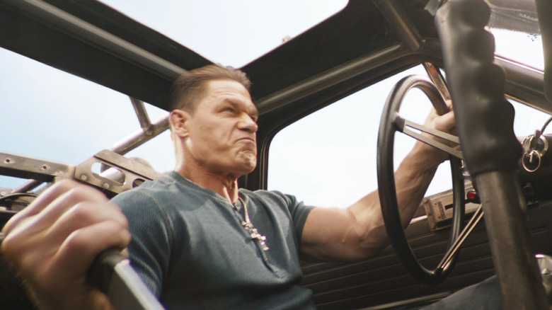 The first ridiculous moment comes early in the trailer, showcasing the unreal strength of the newest Toretto, Jakob (John Cena). It's a brief moment, but it shows that borderline super-heroic power runs in the family, as Jakob grabs a faceless goon and straight up slams him so hard against the floor that the poor bad guy goes directly through it down to the next floor. Jakob's brother Dom (Vin Diesel) has shown similar preposterous feats of strength, whether it was fighting ten men at once in "F9: The Fast Saga" or stomping on concrete so hard that the parking garage he's fighting Shaw (Jason Statham) in collapses all around them.