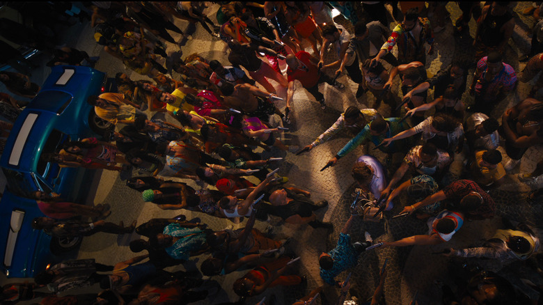 If there's one thing that characters like to do in the "Fast & Furious" movies, it's to show their strength and reputation in the most absurd way possible. In another scene reminiscent of "Fast Five," both Dom and Dante show the reach of their influence as a large number of extras pull out guns to intimidate and show their allegiance to the two characters. However, the spacing of the crowd of people makes this all impractical. I understand it's only a way of showing bravado and that, in reality, a shootout won't happen in the movie. However, that doesn't stop this scene from being ridiculous, and if even one hypothetical fictional bullet were fired, it would essentially be the end of the franchise. Also, all those guns are way too close to Jason Momoa's face. If fired, they would hurt his hearing (or worse).