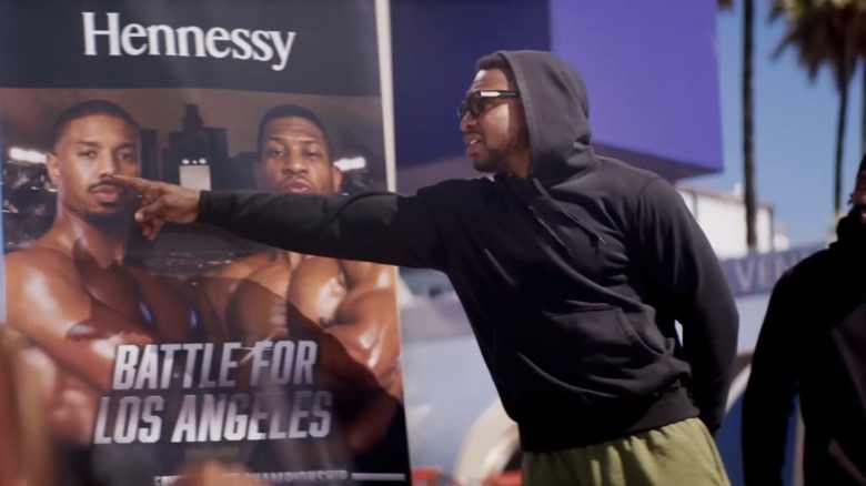 Jonathan Majors' other funniest moment comes a few scenes later when he finally meets Adonis Creed's family for the first time. This is still early in the film before we have a handle on exactly what kind of character Dame will be — enemy or friend. Walking into the Creeds' gorgeous mansion in the hills above Hollywood, Dame jokes that he found the house by asking someone, "Where the Black family live at?" He then compliments "the see-through floors" that allow him to notice Adonis and Bianca's daughter, Amara (Mila Davis-Kent), heading down to meet him.