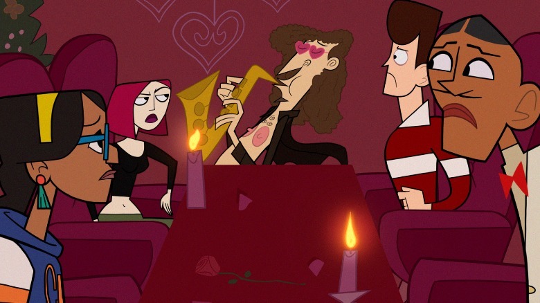 Frankly, the new season of "Clone High" sounds wild as hell, and the first-look images shared alongside the cast reveal are equally off-the-wall. One shot shows Principal Scudworth (Lord) playing a saxophone while wearing an open shirt and a pair of heart-shaped glasses for what's apparently his special introduction to "Saxual Education Week." Another features clone teens — including Miller's JFK – standing outside The Grassy Knoll, a retro diner that's on fire. Finally, a third still shows Joan and JFK doing the classic tongue touch from the show's opening credits while Abe cheers them on.