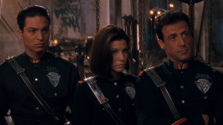 Indeed, Bullock's character and Stallone's character do have a love scene in "Demolition Man," but, because of the fineries of a sterile, touch-free future, sex is achieved through a pair of head-mounted, V.R. devices. Sex is touch-free. Acting opposite a star of Stallone's stature was intimidating enough, but having to enact a virtual sex scene was especially nerve-wracking for Bullock. Bullock, according to the Times article, had replaced actress Lori Petty at the last minute. Petty, more comfortable with comedy, was already well-suited to the role of Huxley, so Bullock was doubly overwhelmed.