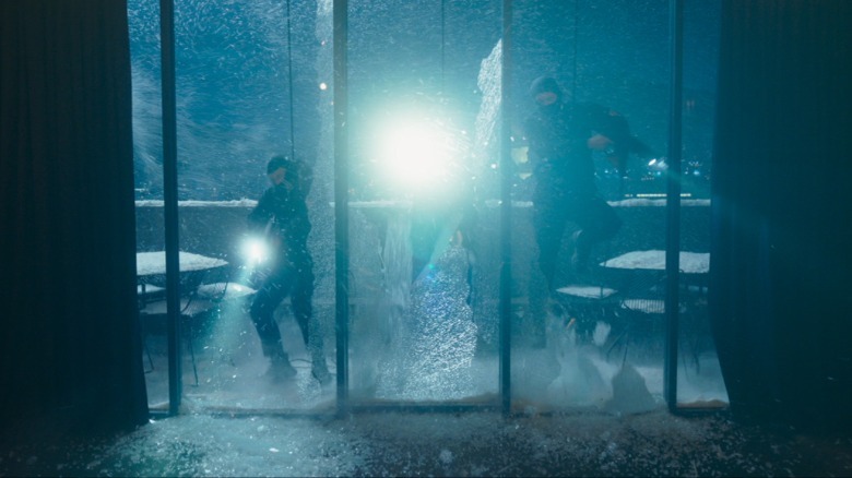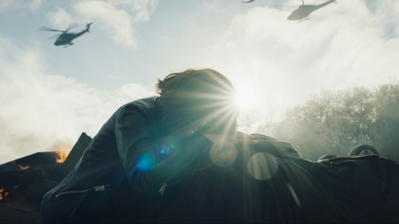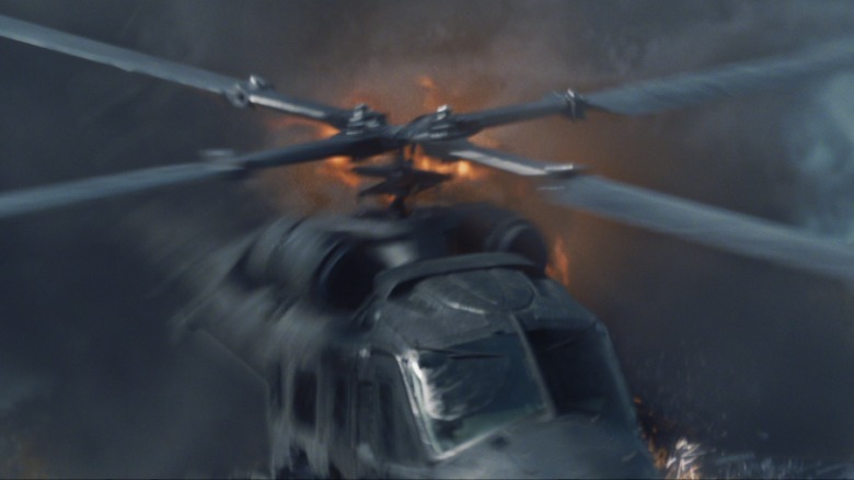 We then get some well-disguised henchmen breaking into an undisclosed building, and they don't appear to be doing by-the-numbers work here. Are these bad guys? Are good guys operating in the grey? We've also got a pretty cool shot of G'iah back-to-back with another unidentified person getting ready to rock, guns in hand. And oh yeah, a big helicopter crash. Is this connected to that convoy sequence from earlier, perhaps?