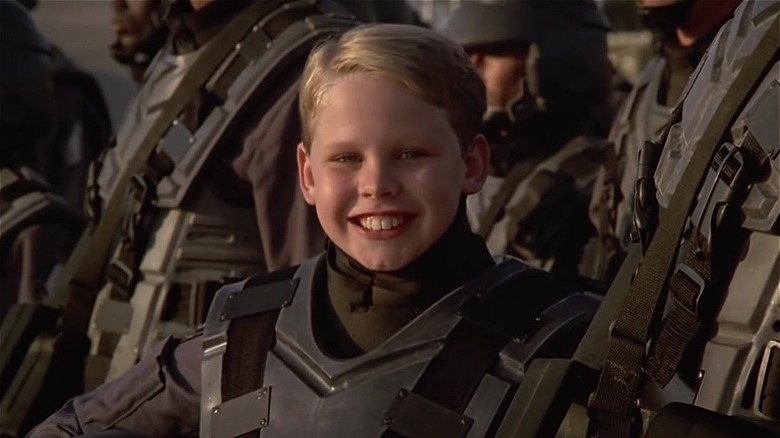 In the film's opening propaganda film, we see a mass of soldiers preaching about doing their part. Then, a child appears, helmet in hand, and says, "I'm doing my part, too!" The Federation uses this for comic effect, but there is a sinister agenda here, too. The Federation is in constant need of soldiers, and it knows that children's malleable minds are vital in securing this human stream. Children conditioned by militarism are far more likely to oblige notions of service and sacrifice — no matter the purpose.