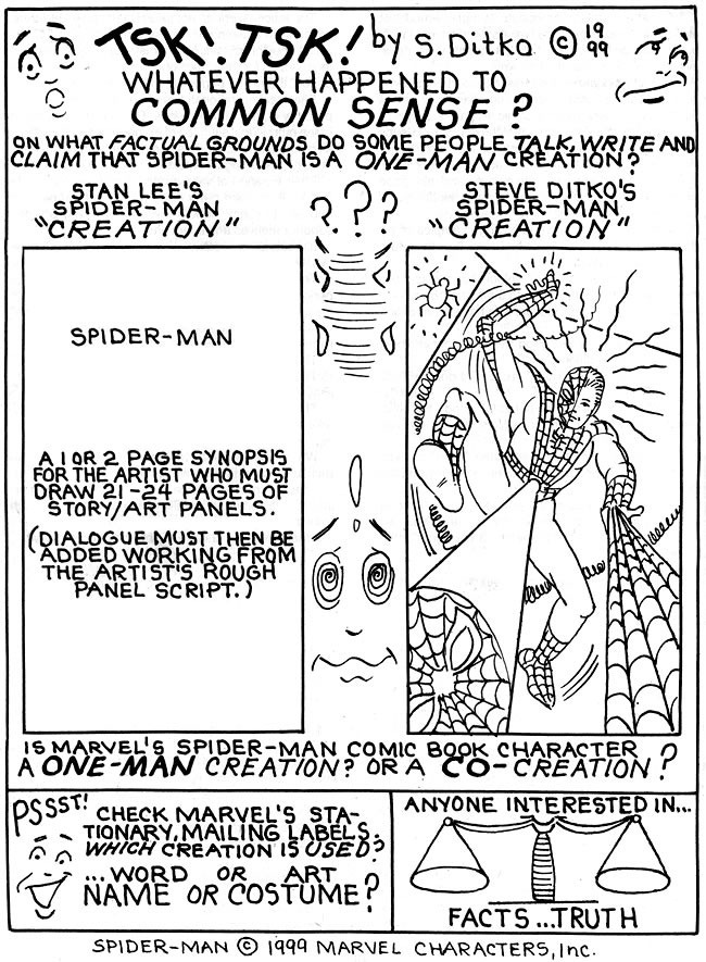 In 1999, Lee penned a letter saying he had "always considered Ditko the co-creator of Spider-Man." This didn't satisfy Ditko, who drew the following comic that neatly summarizes the dispute between himself and Lee: