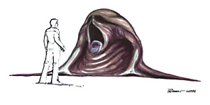 Armus isn't harmed by phasers, and, at one point, sucks Commander Riker (Jonathan Frakes) into its body. While inside, Riker is seemingly reduced to a liquid state wherein he is savagely tortured. Armus then reconstitutes Riker and spits him back onto the desert floor of Vagra II. At a convention attended by this author, Frakes admitted that he actually had to climb into a pool of ink-black Metamucil, an unpleasant experience to say the least. This story, however, was contradicted by the "FX Journal" which stated that Frakes' stuntman was used for the submersion scene.