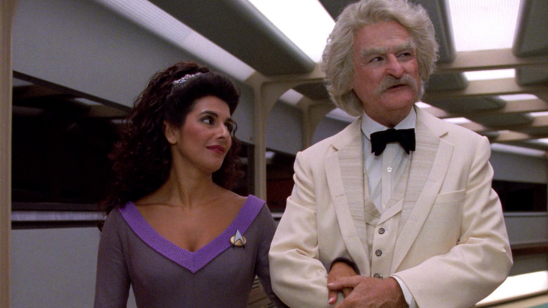 Also, not to disappoint viewers, the writers of "Time's Arrow" also wanted to feature a scene wherein Twain is brought back to the future where he would be allowed to wander the halls of the Enterprise. In a notable scene with Counselor Troi (Marina Sirtis), Twain finds the post-capitalist utopia of "Star Trek" baffling. He initially assumes that the Enterprise is built to destroy cities and engage in military conquest; he's heard the "we're only here to explore" line from too many colonialists in the past.