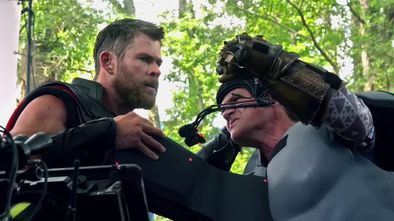 When it came to giving the other actors something to work with, Brolin was crucially on set during filming, including at the climactic "Snap" sequence at the end of "Infinity War." According to The Hollywood Reporter, he often wore a backpack that had a pole extended upwards to indicate where the other actors should look. His on-set performance was captured by a motion-tracking camera, and then effects artists from both Weta Digital and Digital Domain developed the look of Thanos around that performance. This involved a combination of machine-learning, CG doubles of both Thanos and Brolin, and animators crafting images by hand.