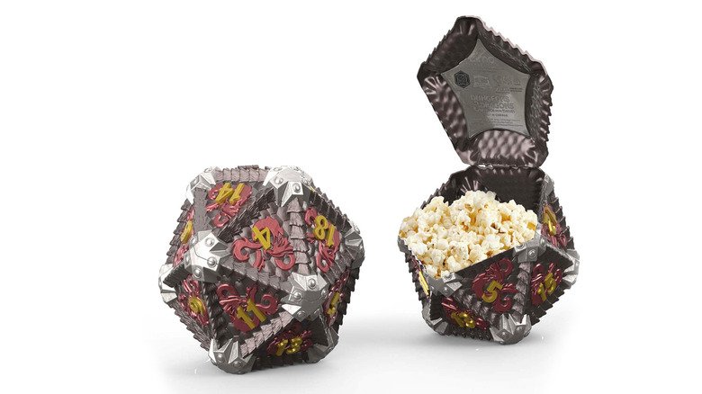 The 20-sided die popcorn container released for last year's goofy, underwatched comedy "Dungeons and Dragons: Honor Among Thieves" may be the platonic ideal of popcorn vessels. In terms of design, it doesn't get much more flawless than an angular, holdable novelty piece that looks entirely like a collectible until you open a panel on the top to reveal the treats inside. It looks easy to carry and clutch, capable of holding a good amount of popcorn, and versatile — once you finish your initial batch of popcorn, this is basically a geeky storage cube.
