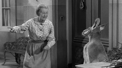 "The Giant Jackrabbit" has a premise straight out of a Robert McKimson cartoon: the uptight Mr. Drysdale (Raymond Bailey) finds a kangaroo in his backyard, knowing it to have been delivered to his home as an elaborate prank from a fellow banker. The kangaroo flees into the Clampetts' yard, where Granny mistakes it for a giant jackrabbit. Every time she tries to show the kangaroo to Jethro, it hops away, leaving Granny looking insane.