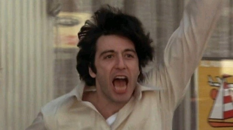 Al Pacino shouting "Attica! Attica!" in "Dog Day Afternoon" is brief, but it is one of his most well-known yelling scenes. As bank robber Sonny Wortzick, Pacino almost leaps off the screen as a ball of manic energy and sweat. Sidney Lumet's kinetic and documentary-style direction of "Dog Day Afternoon" deftly builds the tension up until this moment when Sonny finally steps out of the bank and confronts the cops, snipers, and throngs of excited onlookers. When Captian Moretti tries to goad Sonny into releasing the hostages, Sonny makes his distrust of him and his fellow "pigs" known, and frames his actions as anti-establishment, by screaming "Attica!" This references a 1971 prison riot where inmates protested their inhumane conditions. When Sonny effortlessly rouses the crowd to chant "Attica!", the surrounding officers realize they're dealing with a passionate loose canon who has taken these hostages. It's clear that this going to be one long, hot afternoon trying to resolve the situation.