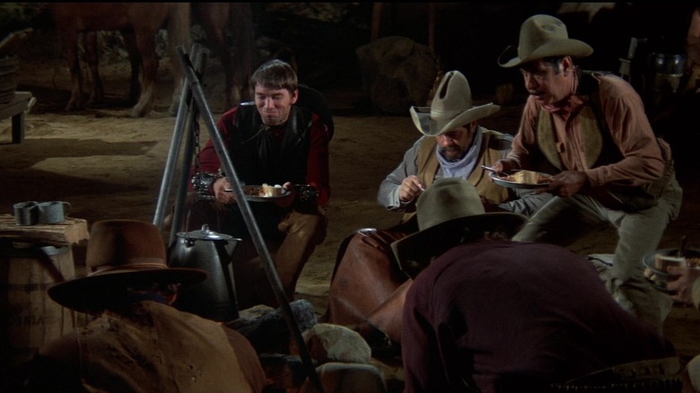 But then there's a third. And a fourth. The camera rests on the campfire, a wide shot of a dozen cowboys. They burp in addition to farting. They fart some more. The gas expulsions begin to overlap in what can only be called an orchestral fanfare. The fart joke goes from being a single jejune giggle into sublime comedic genius. The scene lasts a full minute, and it's the greatest fart sequence in the history of cinema.