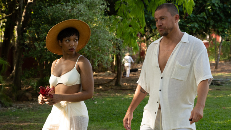 Frida (Naomie Ackie) desperately needs a vacation, and her dream comes true when, at her job as a catering waiter, she meets quasi-canceled billionaire Slater King (Channing Tatum), who has recently returned to public life after some time away due to some unspecified bad behavior that required a public apology. But that doesn't seem to bother Frida too much, and the two strike up a flirtatious back-and-forth. By the end of the night, Slater has invited Frida and her roommate Jess (Alia Shawkat) to come to his private island with his entourage, including a polaroid-snapping fiend named Vic (Christian Slater), a failed screenwriter (Haley Joel Osment), a tech bro (Levon Hawke), a foodie (Simon Rex), and three hot women: Sarah (Adria Arjona), Heather (Trew Mullen), and Camilla (Liz Caribel). The island is a tropical paradise where Champagne is always flowing, drugs are always available, free clothes and perfume are in their bungalows, and the days blend into each other. It seems like Frida has hit the jackpot: She's vibing with a hot rich guy, and her best friend is right by her side. Or is she?