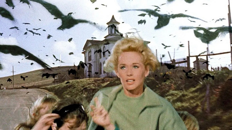 Hey, have you heard of this Alfred Hitchcock guy? He's pretty good! But seriously folks, there's a reason Hitchcock is so revered: he made some fantastic films. "The Birds," released in 1963, is one of the best of the best — an eerie horror movie about, you guessed it, birds! In the film, sexy socialite Melanie Daniels (Tippi Hedren) has the hots for a lawyer named Mitch (Rod Taylor), and decides to more or less stalk him back to his home in Bodega Bay, California. But once Melanie is in town, things start to go awry, mainly due to sudden strange behavior of birds. Without warning, birds begin attacking folks and causing havoc. Why is this happening? Does it all have something to do with Melanie? Is it just a case of nature run amuck? "The Birds" never gives us an answer, and that's part of what makes the movie so effective. Hitchcock employs brilliant film techniques and unconventional editing to draw us into the film, which has no musical score save for the sounds of birds.