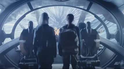 There's an expectation created by designing the opening to reference "A New Hope," where the audience is waiting for another ship to come racing overhead, chasing the ship. It almost comes out like a jump scare when the boarding harpoons jet in from the screen left into the ship. Once we're inside the "Skeleton Crew" ship, the crew assembles behind crates and down hallways, just like the Alderaanian crew of the Tantive IV trying to protect Princess Leia and the plans to the Death Star. They have the same sort of plaintive looks on their faces as they await whatever fate will befall them. George Lucas was very deliberate in his choices of color and costume in "Star Wars." You could see the faces of the good guys and they were wearing colors. As the bad guys stormed through the hallways, they were masked and wearing stark black and white. Here, in the far-flung hyperspace lanes, things aren't so clear.