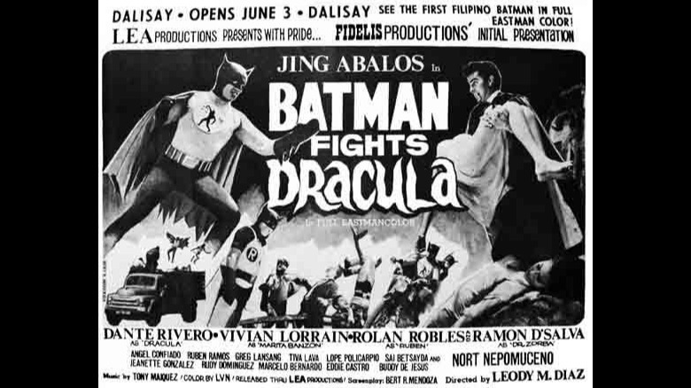 No such luck for the other Batman/Dracula movie, which is considered outright lost (at least for now). "Batman Fights Dracula" was a 1967 film released and distributed in the Philippines. Batman's (Jing Abalos) foe Dr. Zorba (Ramon d'Salva) resurrects Count Dracula (Dante Rivero) to vanquish his foe. Instead, Batman's commitment to justice wins over Dracula. Like Warhol's movie, this film was an unauthorized adaptation and no footage is known to have survived. However, some stills and posters from "Batman Fights Dracula" have been recovered.