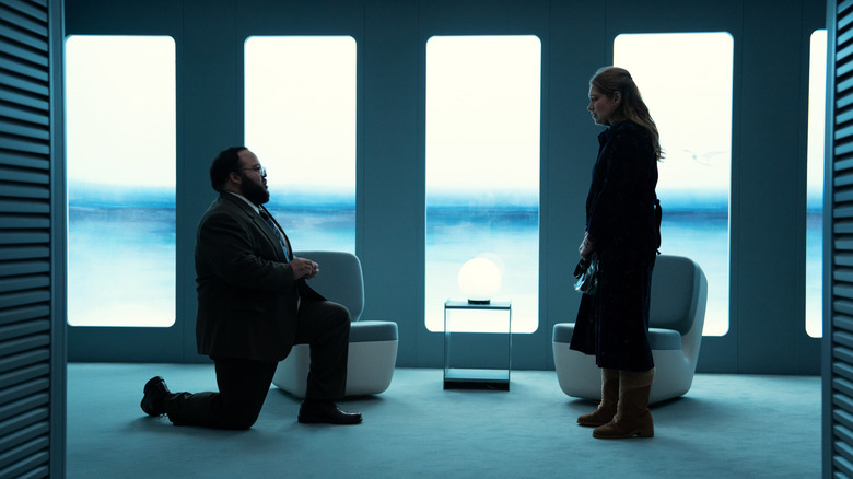 Gretchen George (Merritt Wever) has been visiting Dylan's innie, who just goes by Dylan G., at Lumon throughout season 2 — because, as a twisted reward probably meant to keep him happy and working efficiently, Dylan has been granted a visitation room as a Lumon "perk" where his innie can interact with his real-world family. Where Gretchen and Dylan's relationship outside of Lumon is strained, to say the least, Gretchen can't help but feel drawn to the sweet, thoughtful, and attentive version of Dylan she meets in the bowels of Lumon, but this perk leads to a truly gutting situation with another of Dylan G.'s hard-earned "perks."