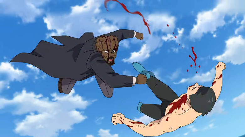 In the midst of this, Conquest (the Viltrumite Elite Anissa warned about, voiced by Jeffrey Dean Morgan) arrives to beat some sense into Mark. Their battle, though surprisingly close to evenly matched, still nearly kills an exhausted Mark. Eve arrives and is nearly killed, but this state allows her to overcome the mental restrictions that prevent her from manipulating biological matter — she then flays Conquest alive so Mark can seemingly kill him. Mark tells Cecil to burn the body, but, of course, Cecil refuses to listen and keeps Conquest as a captive informant.