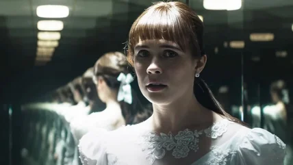 The wedding dress mirror room scene blends classic cinema with contemporary horror themes