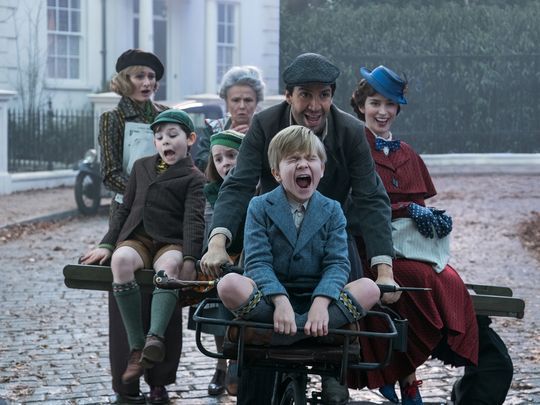 The last image is a more mundane one compared to the previous stills, but hey, it's been a while since you've heard about Mary Poppins Returns, isn't it? The new image of the sequel starring Emily Blunt in the title role shows Mary Poppins and Jack (Lin-Manuel Miranda) playfully carting around a group of children that Mary is looking after, as Jane Banks (Emily Mortimer) and Ellen (Julie Walters) look on in shock.