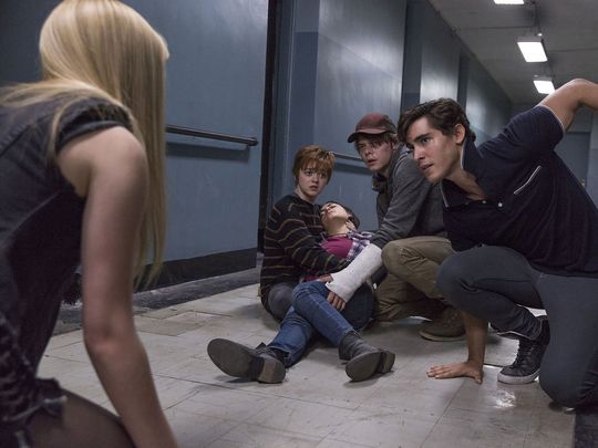 The New Mutants image depicts the confused, powerful teens in the halls of the psychiatric hospital holding them hostage. The anxious young mutants Magik (Anya Taylor-Joy, far left), Wolfsbane (Maisie Williams), Cannonball (Charlie Heaton) and Sunspot (Henry Zaga) are gathered around Mirage (Blu Hunt), who lays unconscious on the floor.