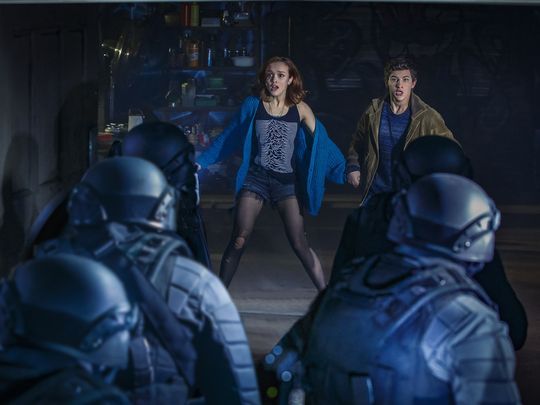 The Ready Player One image features Wade Watts (Tyler Sheridan) and Artemis (Olivia Cooke) fleeing from their own set of intimidating armed men in Steven Spielberg's upcoming film. Their drab clothes and setting indicates that this is reality, and not the virtual reality world Oasis.